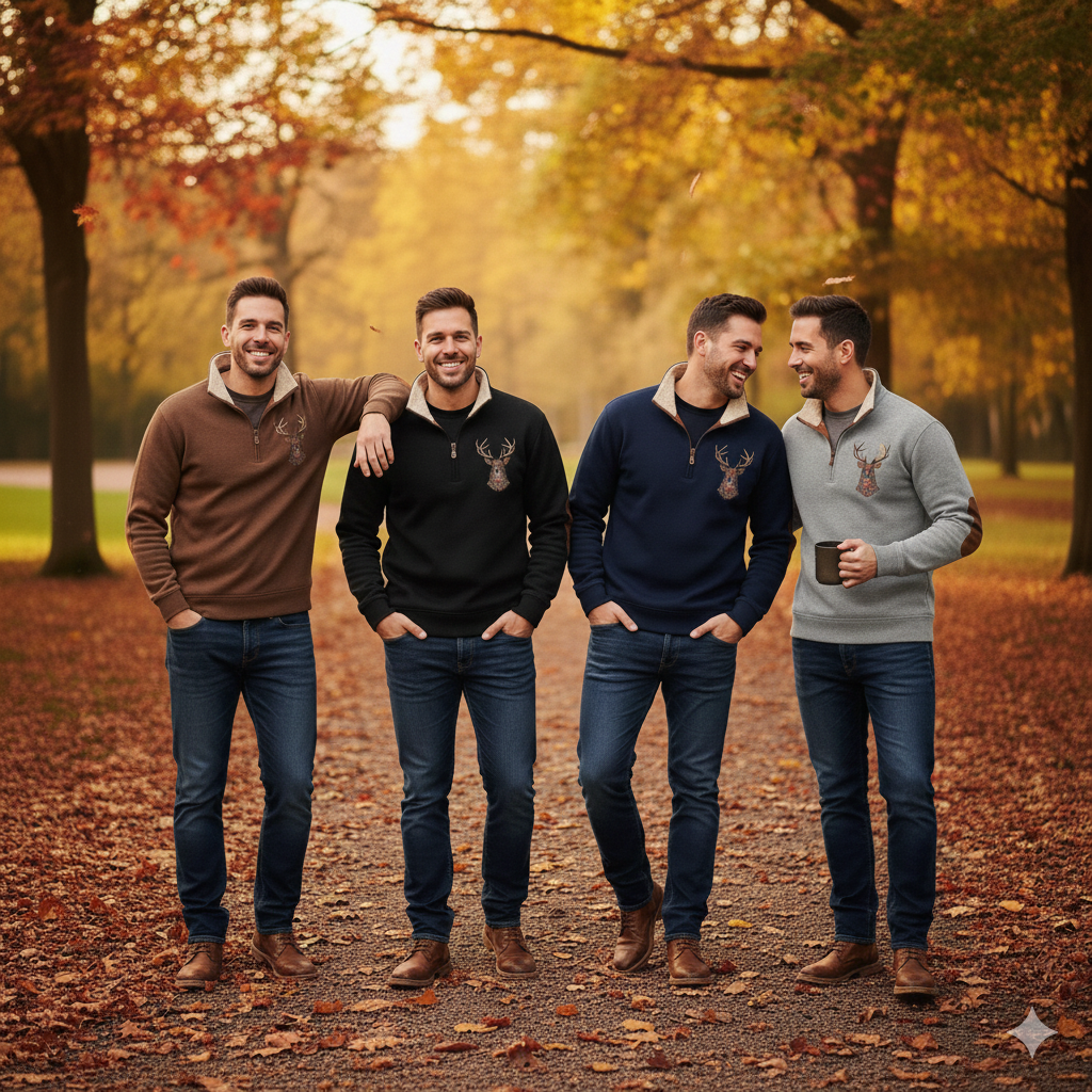 Design masculin et authentique – Son col zippé façon cuir, ses coudières contrastées et son emblème cerf finement brodé apportent une touche de caractère et de distinction.